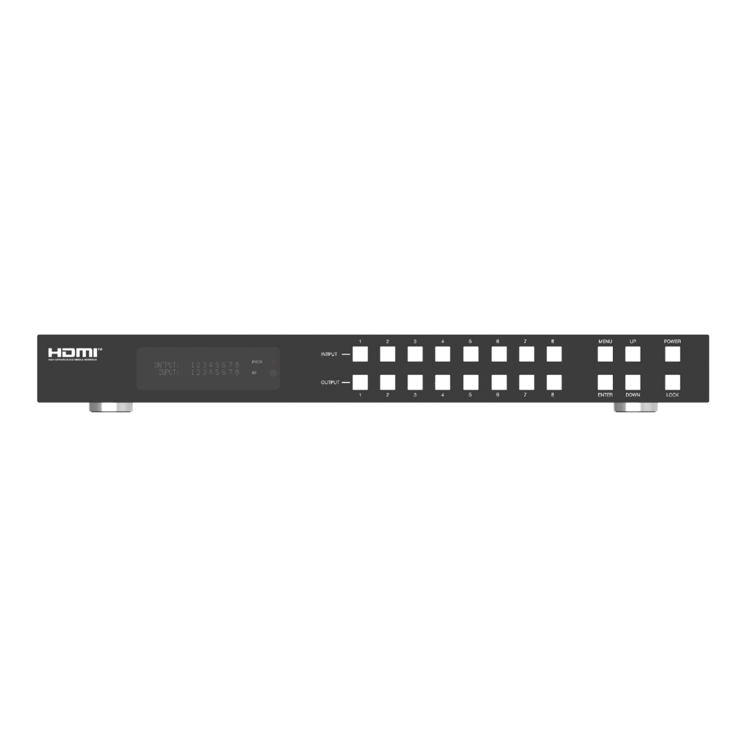 Permite enrutar libremente hasta 8 fuentes HDMI a 8 pantallas de forma individual o combinada. Es compatible con video en ultra alta definición (4K@60Hz 4:4:4), ofrece conmutación instantánea sin cortes, y cuenta con funciones integradas de procesamiento de video, escalado, resincronización y desincrustación de audio, todo ello gestionable a través de diversas interfaces de control.